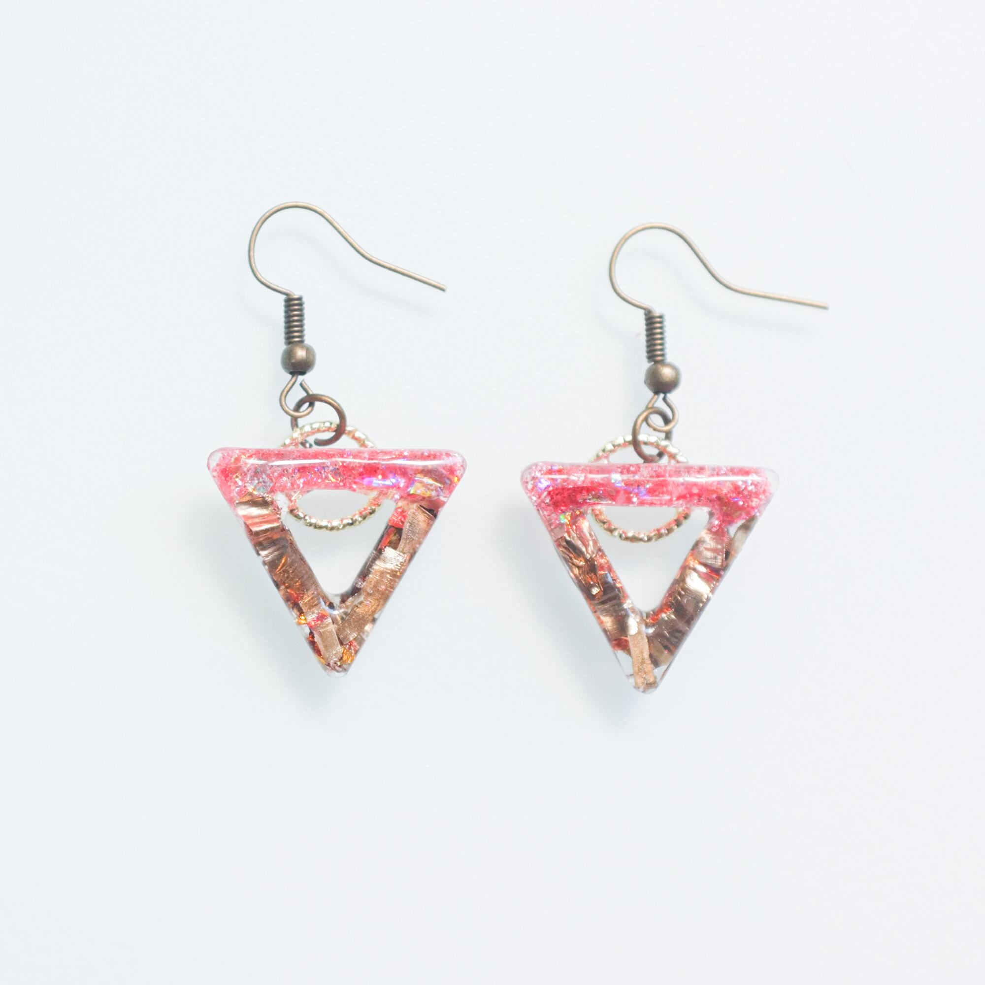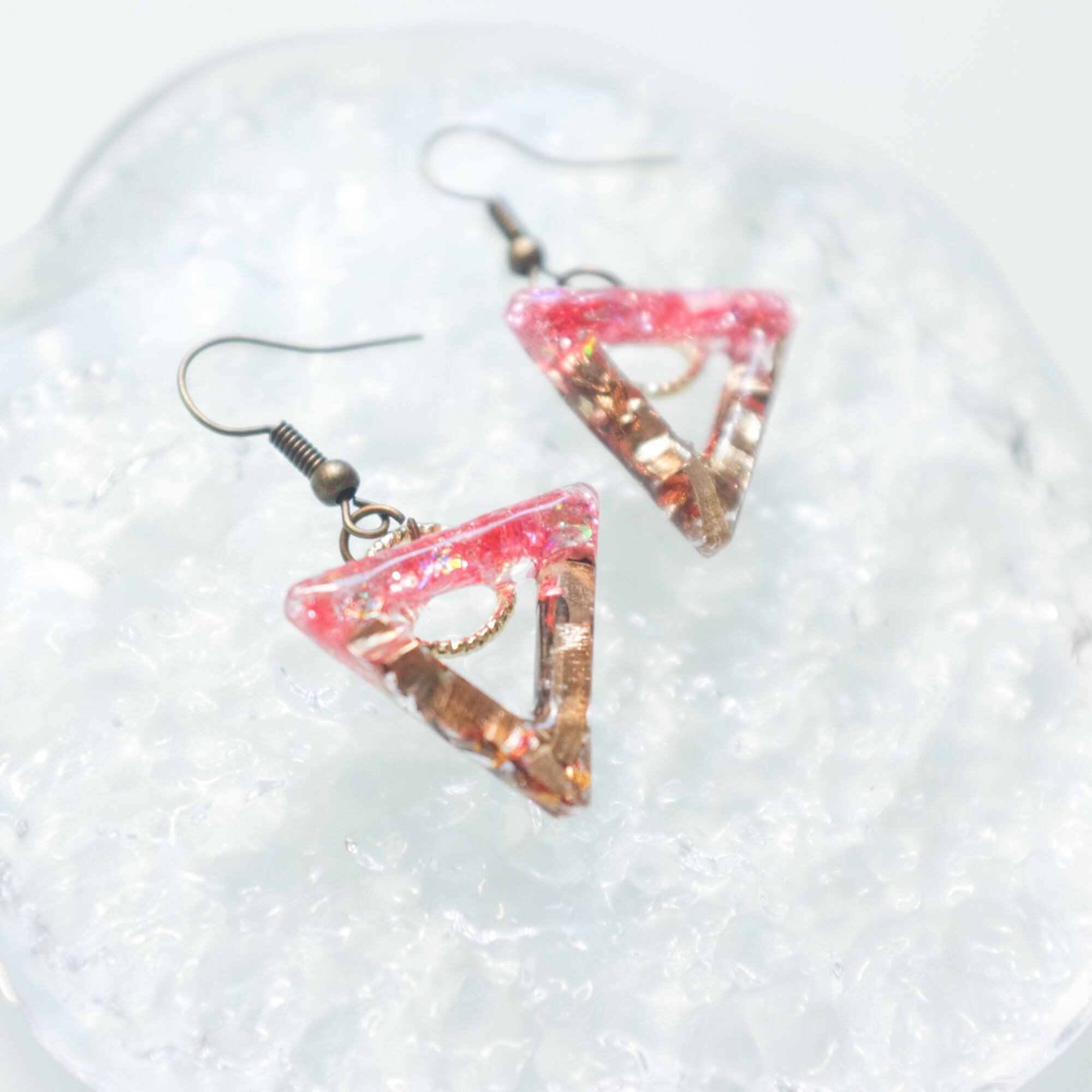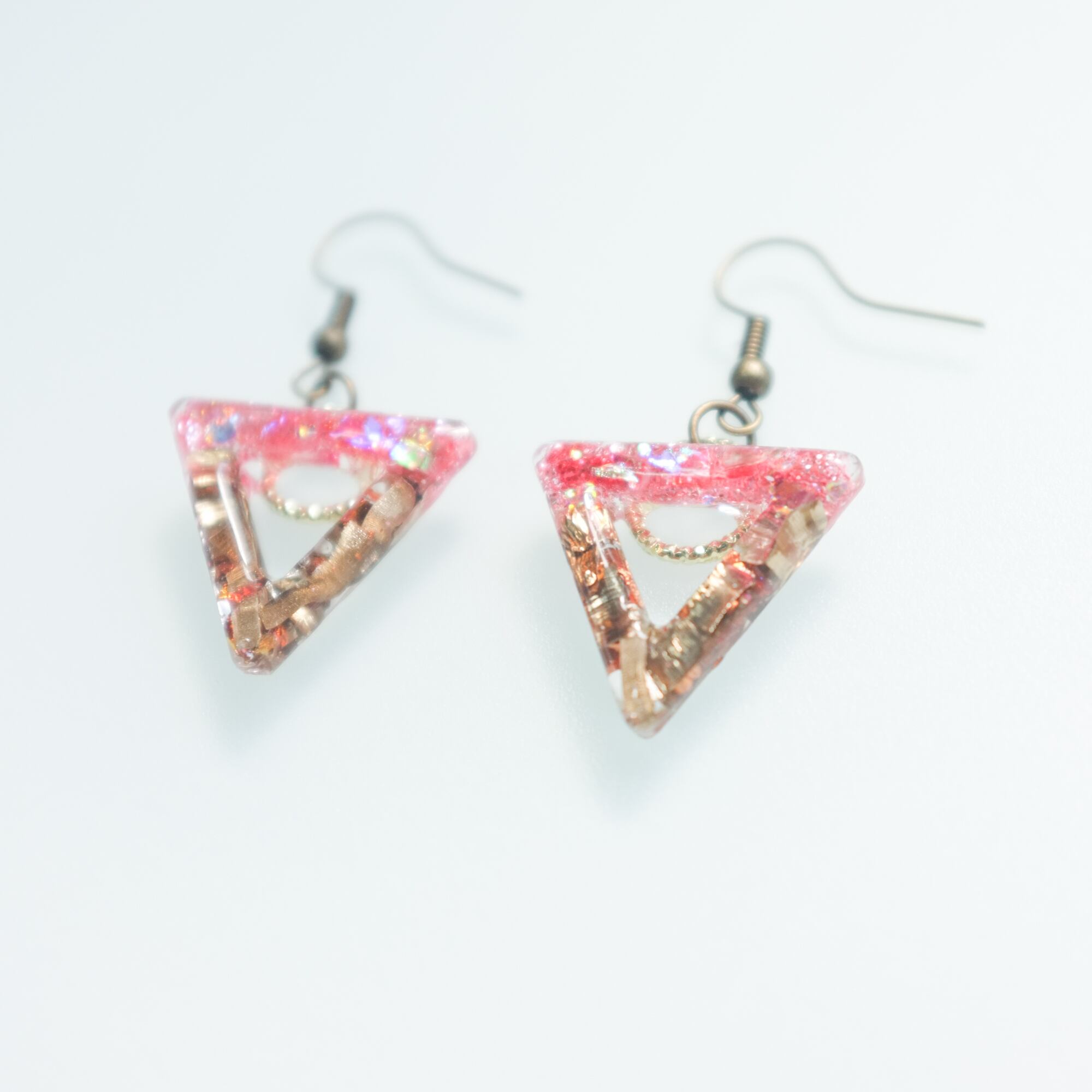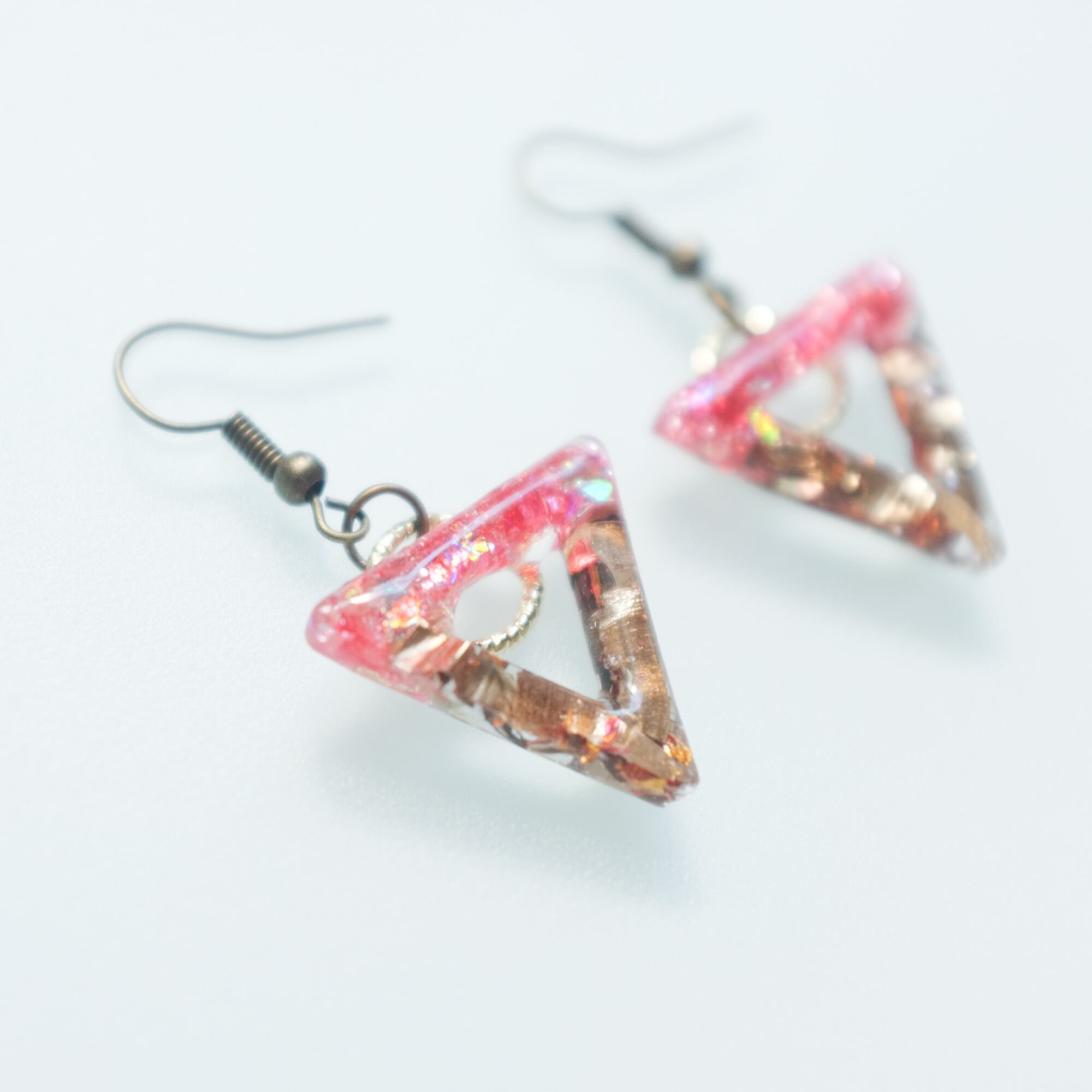 ピンクのホロを使い明るい色味でお作りしました、また向きを決めていない為ゆらゆら動きのあるピアスです。